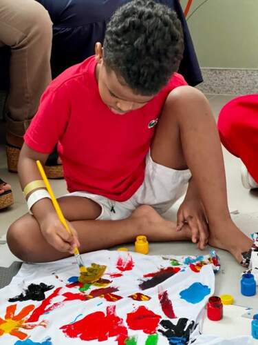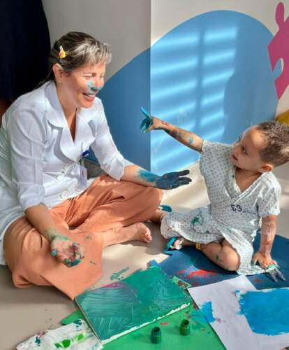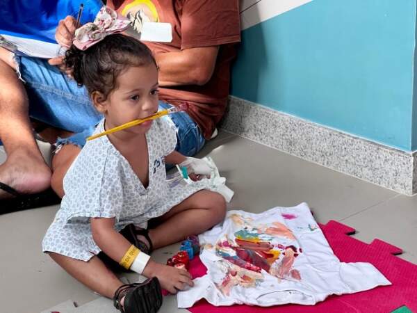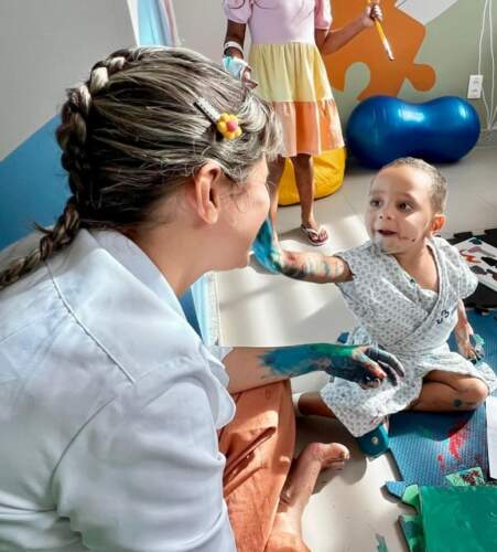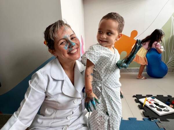Já Maria Cecília, de quatro anos, abandonou o pincel e preferiu usar os dedos para pintar. Enquanto Artur, de um ano e dez meses, aproveitou o dia em que recebeu alta da UTI para “pintar o sete” na brinquedoteca. “Artur tem asma, e já passamos por vários hospitais, mas nunca vimos um acolhimento como o daqui. O carinho e a qualidade da assistência das equipes e essa programação especial, não encontrei em hospital algum”, contou emocionada a mãe de Artur, Luciana Ferreira Santos que tem uma filha mais velha de 21 anos e sabe, há mais de duas décadas, como mãe, o que é peregrinar por hospitais.