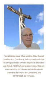 Missa pela passagem dos 30 dias do ilustre conquistense Raul Ferraz. Será dia 2 de dezembro, às 19h, na Catedral Nossa Senhora das Vitórias.