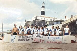 A foto que acompanha a matéria registra aquele momento histórico. Eu em uma extremidade, Betão na outra, e ao centro o time feminino. Foi o torneio de campeões de vôlei de praia, em que nos tornamos campeões do primeiro torneio da Bahia. A competição era mista, com quatro homens e duas mulheres na quadra de areia.