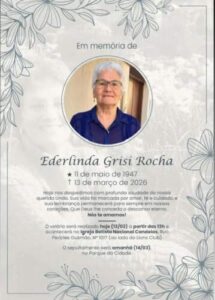 Ederlinda foi uma mulher dedicada à família, guiada pela fé e pelos valores que cultivou ao longo de toda a sua vida. Construiu uma trajetória honrosa e deixa agora saudade entre familiares, amigos e todos aqueles que tiveram o privilégio de conviver com ela.