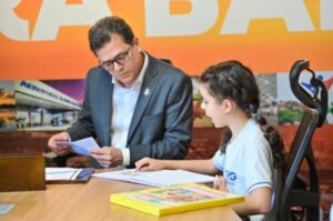 No seu primeiro dia de atendimento no gabinete, o prefeito em exercício recebeu uma visita especial: a estudante Laura Dias, de apenas 10 anos, aluna do Colégio Padre Gilberto, que se apresentou como representante dos colegas de turma.
