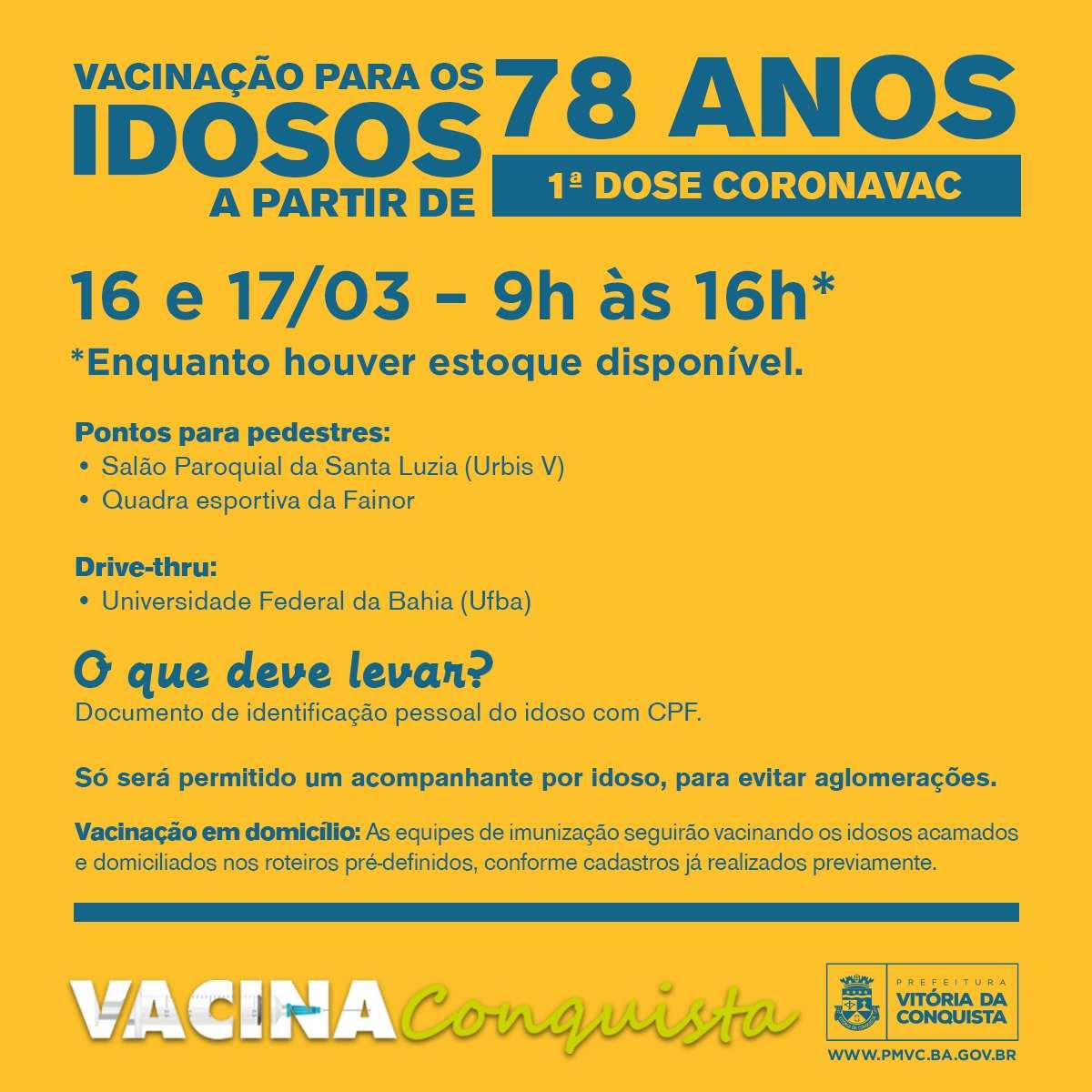 A prefeitura de Vitória da Conquista está anunciando a primeira dose da vacina para os idosos a partir de 78 anos, e no cartaz abaixo estão as explicações indispensáveis aos componentes desse grupo: